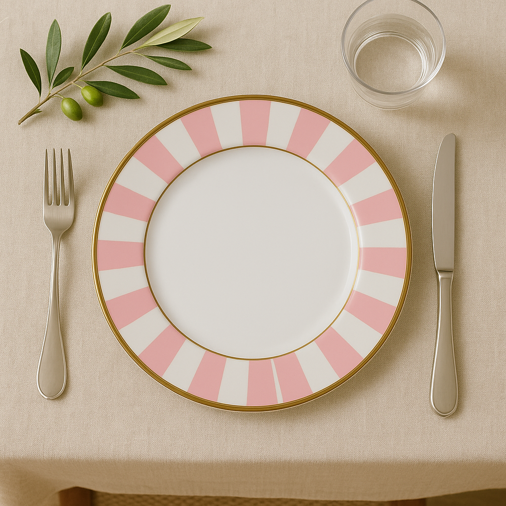 Plato llano para seco en cerámica con borde dorado y diseño de rayas en el orillo. 29.5 cms diámetro x 2.5 cms alto Color blanco con borde dorado y orillo a rayas rosado. CX6