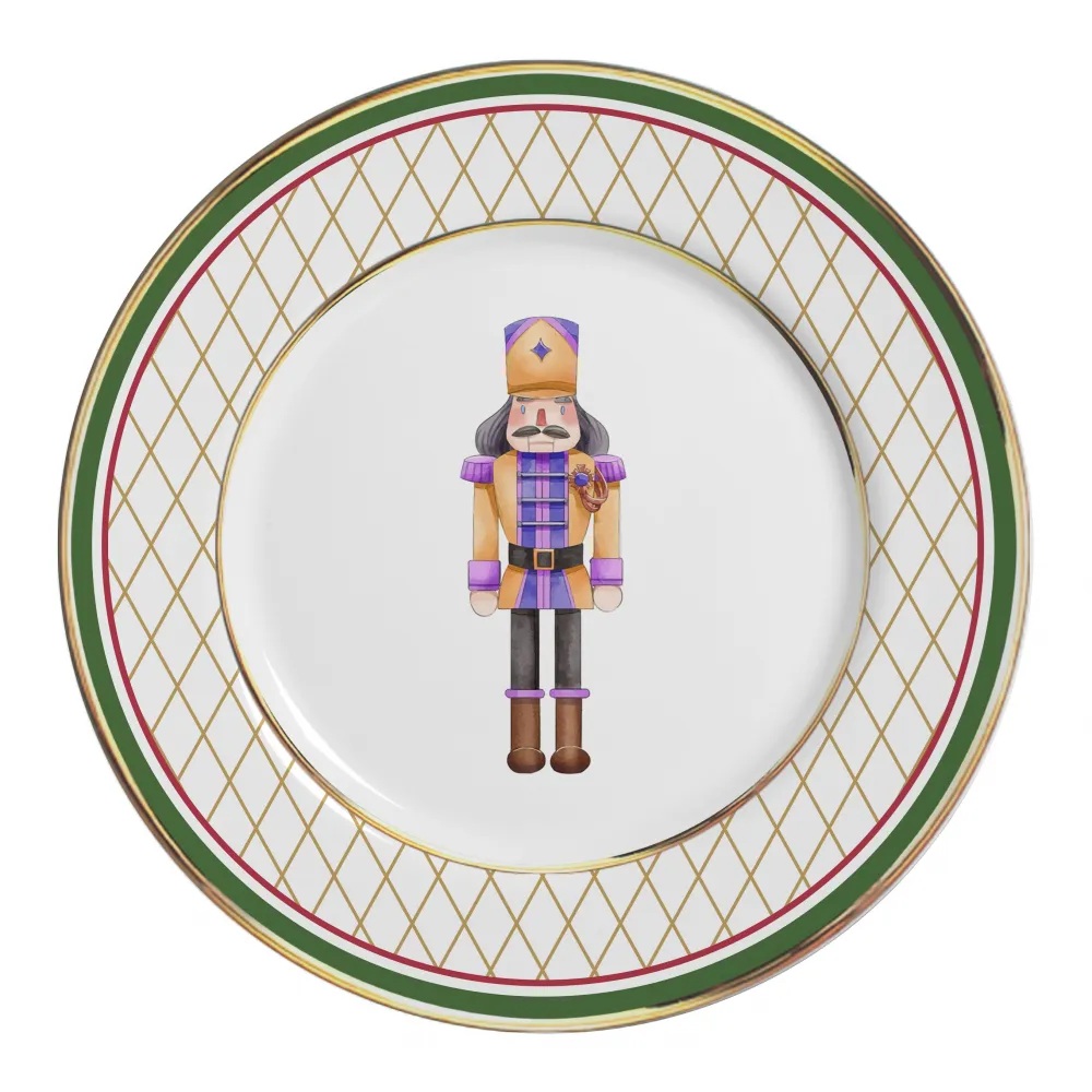 Plato llano para seco en cerámica con proceso de decoración digital, sobre base blanca, motivo navideño (soldaditos). 29 cms diámetro. Multicolor como la imagen con borde dorado. CX6-CX24