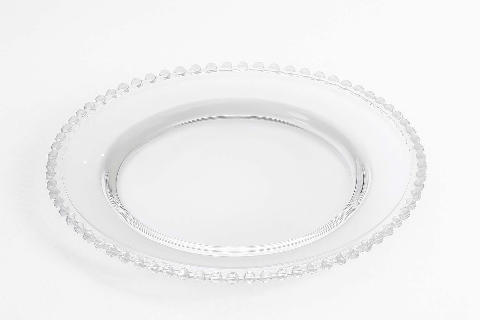 Plato de vidrio llano para seco con diseño en el borde. 27 cms diámetro externo x 24 cms diámetro interno x 2.5 cms alto. Transparente. CX18