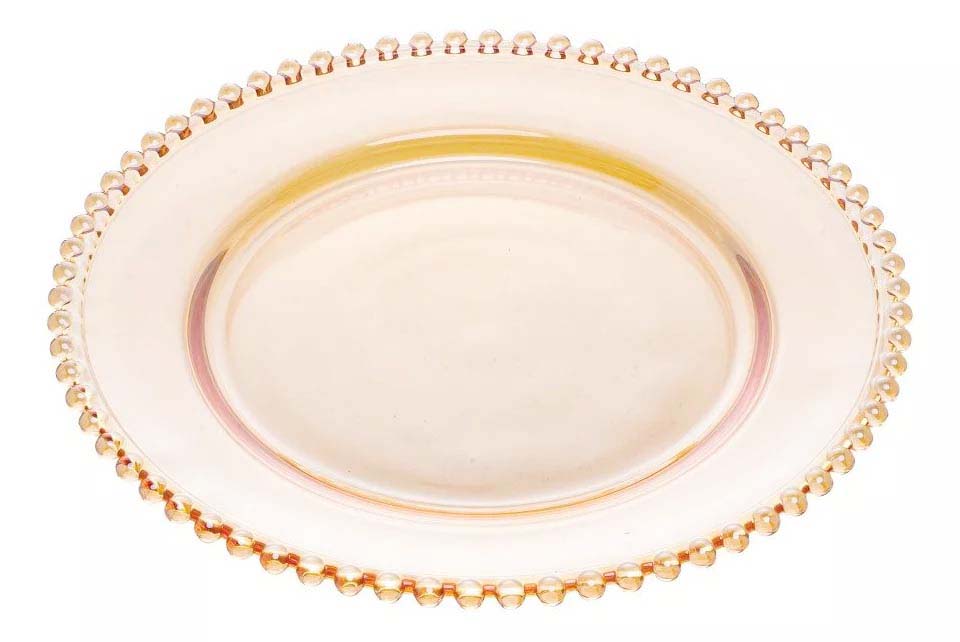 Plato de vidrio llano con diseño en el borde. 27 cms diámetro extremo x 23.5 cms diámetro interno x 2.5 cms alto Ambar. CX6 -CX18