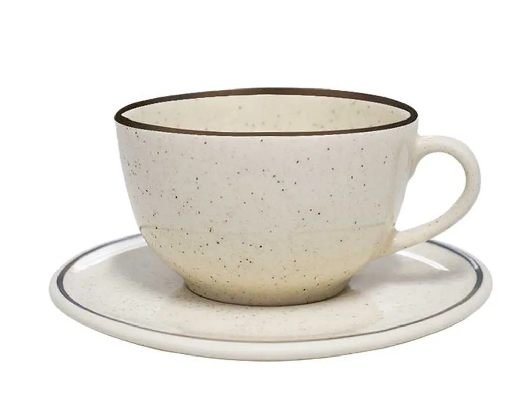 Set de taza para café con plato en cerámica. Capacidad de la taza 7 onzas. Plato de 14 cms diámetro – Taza (9 cms diámetro x 5.5 cms alto) Marrón/blanco SET-CX12SETS