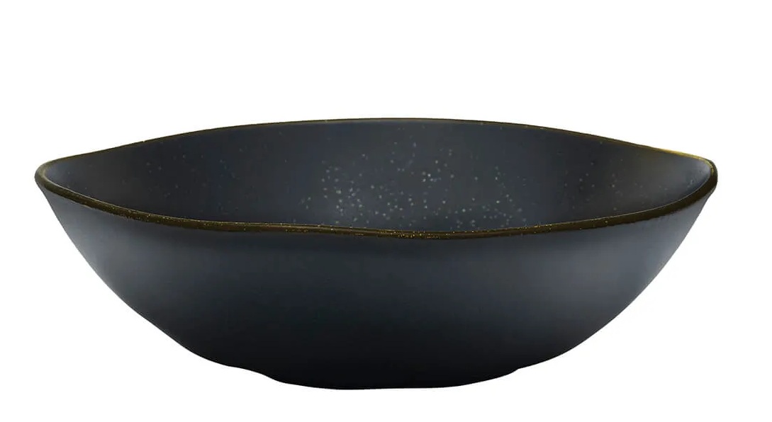 Bowl en porcelana con diseño irregular y una línea de reactivo aplicada manualmente en el borde, capacidad 500 ml. 17.5 cms ancho x 5 cms alto Negro mate con bordes orgánicos en tonos ocre. CX6