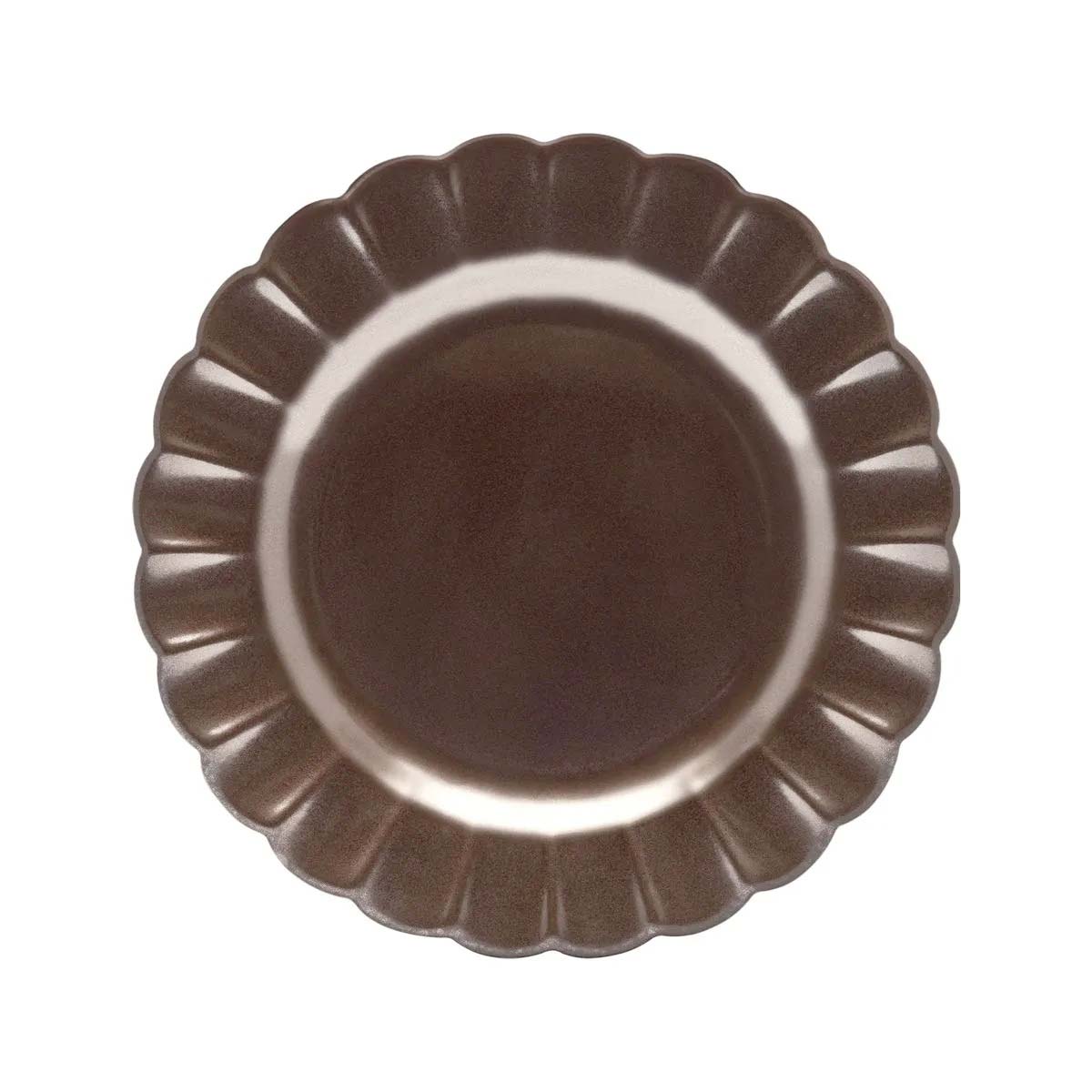 Plato llano para postre en porcelana, esta línea presenta piezas extremadamente finas decoradas con pliegues en relieve inspirados en los pétalos de las flores. 21.65 cms diámetro. Marrón metalizado (Mocha Mousse). CX12