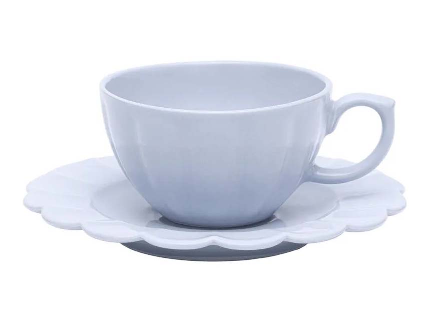 Set de taza con plato en porcelana capacidad de la taza 220 ml, esta línea presenta piezas extremadamente finas decoradas con pliegues en relieve inspirados en los pétalos de las flores. Plato de 16 cms diámetro – Taza de 10 cms diámetro x 6 cms alto. Azul claro, SET-CX12SETS